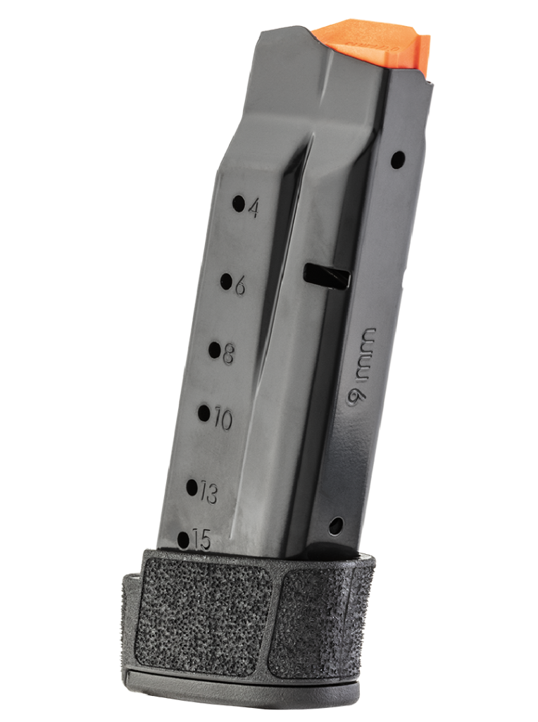 מחסנית 16 כדורים. גוף פלדה מחוזק, בסיס נשלף והזנה חלקה. אמינות גבוהה לשימוש יומיומי ולאימונים מקצועיים.